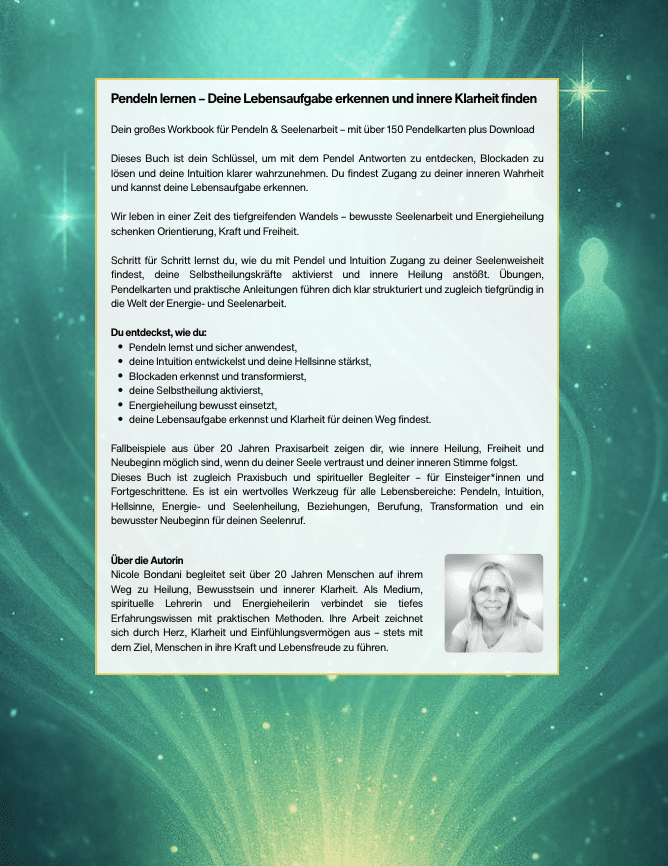Dieses Buch nimmt dich mit in die Welt des Pendelns – dorthin, wo Intuition, Heilung und innere Klarheit beginnen. Entdecke, wie du mit über 150 Pendelkarten deine Selbstheilungskräfte aktivierst und Zugang zu deiner Seelenweisheit findest.