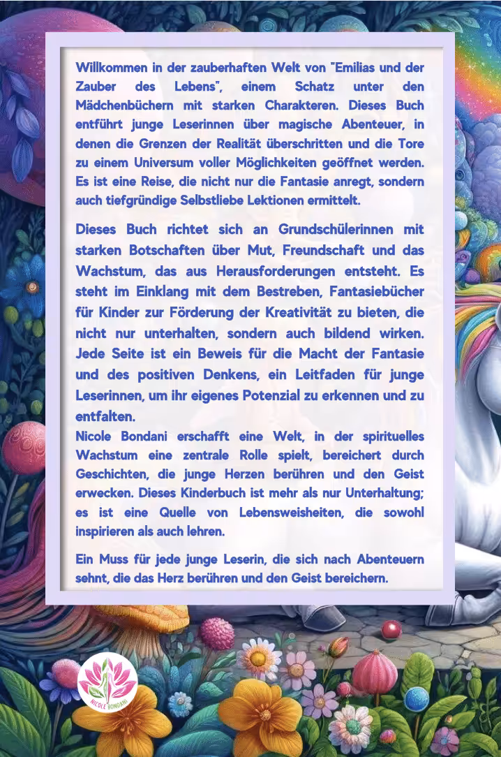 Begib dich auf eine bezaubernde Entdeckungsreise mit der jungen Emilia und ihrer klugen Großmutter. Eine Erzählung voller magischer Momente und lehrreicher Weisheiten, die die Mysterien des Daseins beleuchtet. In diesem Kinderbuch, das vor Charme nur so sprüht, werden die jungen Leserinnen und Leser auf eine inspirierende Expedition mitgenommen. Das Kinderbuch führt durch spannende Bereiche der Spiritualität, des bewussten Seins und der unerschütterlichen Stärke der Zuneigung.